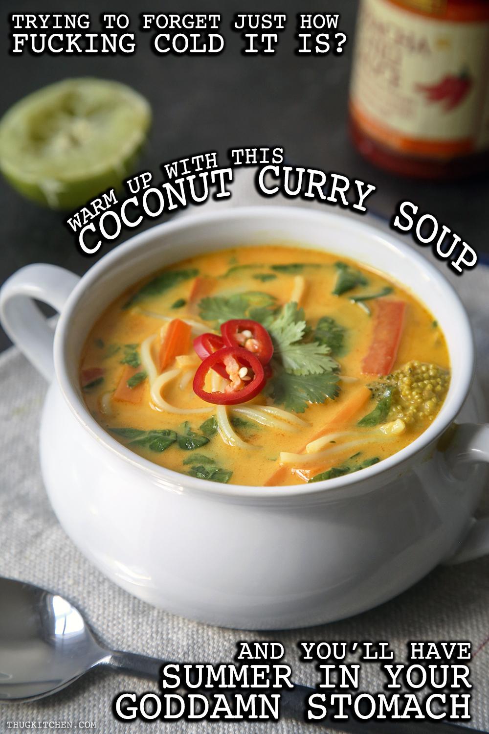 Tired of this fucking weather? Defrost your diet with a big ass bowl of Coconut Curry Soup.