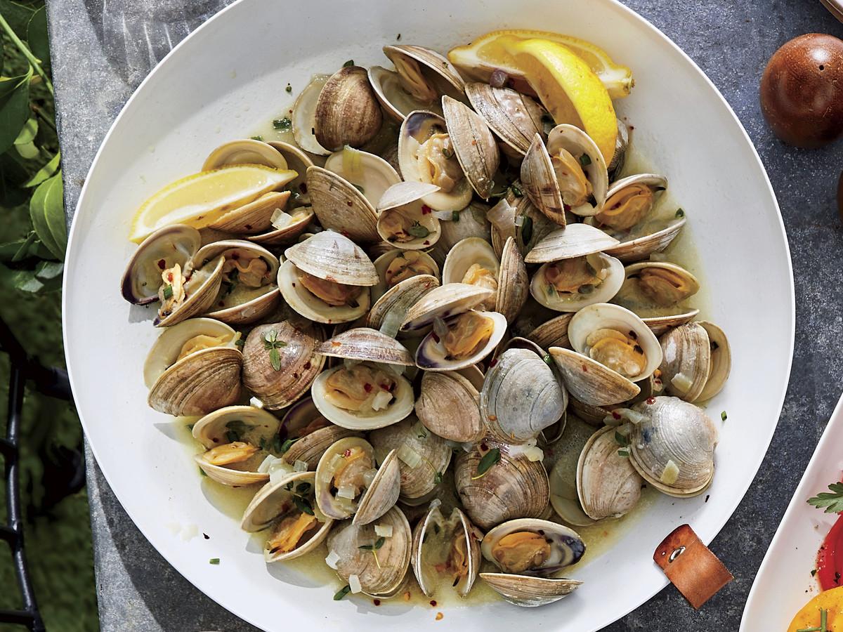 These flavorful grilled clams are perfect for an easy alfresco dinner party. If littlenecks aren’t available at the seafood counter, try steamer, Manila, or cherrystone clams. Avoid chowder clams, which are too big for this recipe. Serve with grilled bread, a big salad, and the remaining white wine for a satisfying warm weather supper.